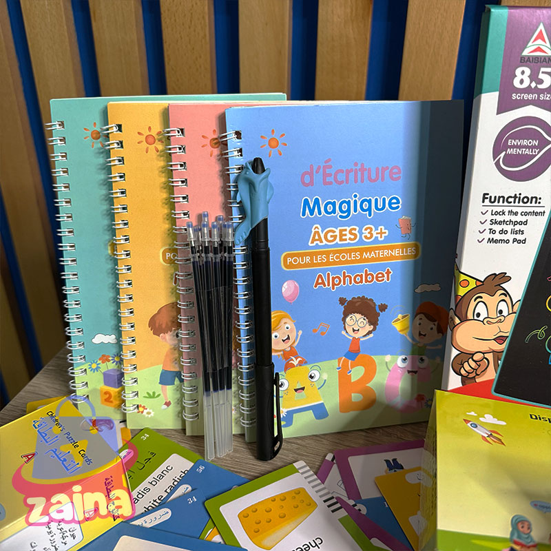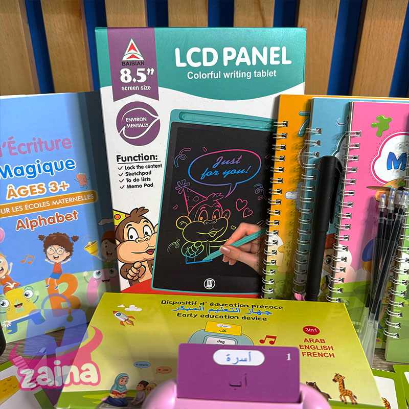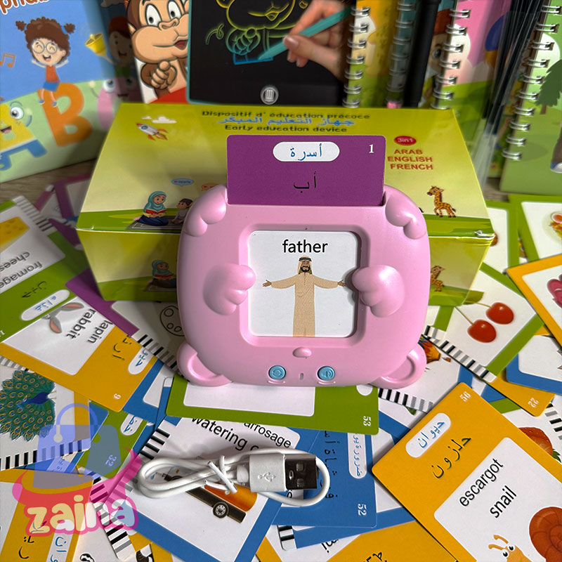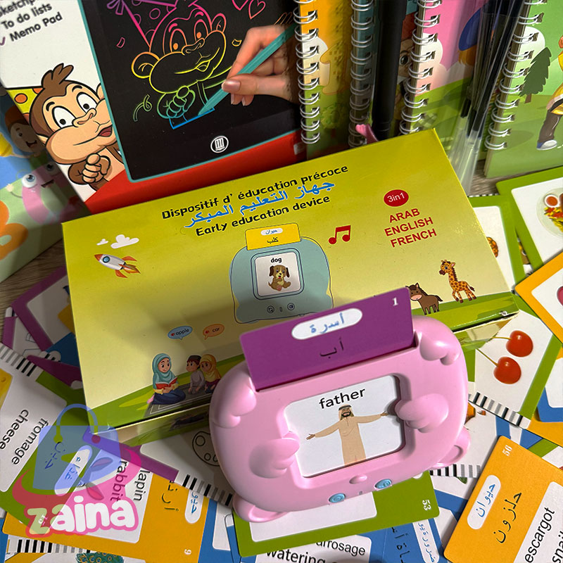 جهاز التعليم المبكر ثلاثي اللغات (عربي – إنجليزي – فرنسي) جهاز ذكي يساعد الأطفال على تعلّم الكلمات والحروف بطريقة تفاعلية وممتعة. يحتوي على 112 بطاقة تعليمية ملوّنة تنطق الكلمات بثلاث لغات، مما يساعد الطفل على تنمية النطق، وتوسيع المفردات، وتقوية التركيز السمعي والبصري. 🔋 قابل للشحن عبر USB – خفيف وآمن للأطفال 🎧 مثالي للتعلّم المنزلي أو في الروض، يجمع بين اللعب والتعليم في نفس الوقت 8 كتب سحرية الميزة لي فهاد الكتب هو ان اي حاجة كتبتيها فيهوم كتمسح بعد دقائق او هاكا عمر هاد الكتب يعمرو او ترميهوم بسبب انهم عمرو بالكتابة لوحة الكترونية LCD حماية العين: لا تحتوي شاشة LCD على ضوء أزرق أو إشعاع، مما يحمي العينين ويكون آمنًا ومريحًا بعد الاستخدام لفترة طويلة. وظيفة المسح والقفل: يحتوي WordPad على وظيفة مسح بزر واحد ووظيفة مسح القفل لمنع مسح التسجيلات المهمة عن طريق الخطأ نضمن لك الجودة… ويشهد بها كل من جرّب منتجاتنا